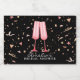 Duas taças de vidro cor-de-rosa com confetes cor-de-rosa e dourados sobre um fundo preto, estes rótulos de mini garrafa de vinho espumante são perfeitos para um tema de chá de noiva brunch e bubbly. Itens COMBINADOS em nossa coleção.