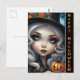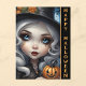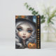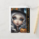 Envie saudações assustadoras com nossa Boneca Bruxa Sinistra e Fofa com Abóbora Cinzelada Cartão Postal Feliz Halloween. Este cartão postal apresenta uma ilustração em close-up de uma boneca bruxa com olhos azuis cativantes, embalando uma abóbora intricadamente cinzelada. As palavras "Feliz Halloween" adornam a lateral, definindo o tom perfeito para uma celebração encantadora. Compartilhe o espírito do Halloween com este cartão postal charmoso e ligeiramente sinistro.