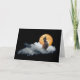 Um bruxo torto-infernal se senta numa nuvem em frente a uma lua de cheio grande neste cartão de Dia das Bruxas ou Samhain.