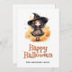 Feliz cartão de Halloween com uma ilustração aquática de uma bruxa num chapéu, abóboras e fantasmas. Personalize facilmente este cartão de Dia das Bruxas fofo para crianças com seu nome e texto de família.