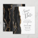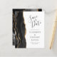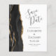 The left-hand edge of this elegant modern wedding save the date card features a black watercolor agate border trimmed with faux gold glitter. The customizable text combines charcoal gray handwriting, copperplate and italic fonts on a white background. The reverse side features a matching black and gold agate design.
