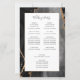 This elegant, modern wedding program features a black agate background trimmed with gold faux glitter. The text appears in elegant charcoal gray handwriting and copperplate fonts on a white rectangle.