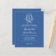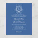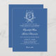 Este convite de casamento apresenta um design clássico e elegante com um esquema de cores azul e branco refinado. A peça central é uma crista monográfica sofisticada, acrescentando um toque personalizado. Os detalhes do convite são apresentados em um roteiro elegante e fonte serif, combinando elementos tradicionais e eternos para criar um belo anúncio para seu dia especial.