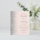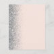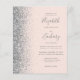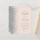 The left-hand edge of this elegant modern wedding invitation features a silver faux glitter border. The customizable text combines gray handwriting, copperplate and italic fonts on a blush pink background. The reverse side features a matching blush and silver design.