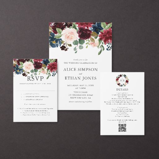 The design is crowned by a stunning watercolor arrangement featuring deep burgundy, dusty blue, and crisp white blooms. This rich, moody palette captures a free-spirited bohemian vibe while remaining undeniably sophisticated. Below the art, your wedding details are typeset in a refined, elegant serif font, ensuring the text is as timeless as the floral artwork. Printed on lightweight, value-friendly paper, this flyer format offers a sleek, contemporary feel that is easy on the wallet and easy to mail.