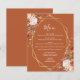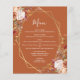 This elegant modern wedding menu features a gold geometric frame decorated with watercolor floral bouquets in autumn colors of burnt orange, peach, burgundy and blush on a burnt orange background. The customizable text combines white whimsical handwriting and copperplate fonts. The reverse side is solid burnt orange.