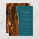 The left-hand edge of this elegant modern wedding invitation features a burnt orange watercolor agate border trimmed with faux gold glitter. The customizable text combines gold-colored handwriting, copperplate and italic fonts on a teal blue background. The reverse side features a matching agate design.