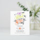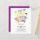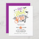 Apresentando as palavras "Coma, Beba, e Seja Assustador" em um esquema de cor roxo, laranja, verde limão e tipografia retrorreflectora, e adornados com morcegos, lua, redes e uma pequena aranha sobre fundo branco esses convites para festas de Halloween são perfeitos para convidar seus amigos e família! Personalize com os detalhes da festa de Halloween em letras brancas em um fundo preto. As cores podem mudar!