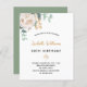 Um convite elegante para uma festa de aniversário 50ª (ou qualquer idade). Um fundo branco chic. Decorados com uma pénia branca, uma flor, folhas florais, verdes de eucalipto, galhos, verde e um purga de ouro falso. Personalize e o nome e os detalhes da festa. Letras pretas e ouros. O nome é escrito com um moderno estilo escrito à mão. Traseira: cor de fundo rosa dourada. Este cartão também está disponível na nossa loja com um fundo de cor verde no verso.
