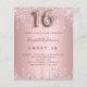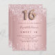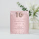 Um convite moderno, na moda e glamouroso para uma festa de aniversário Doce 16, 16. Um rosa empoeirado, cor-de-rosa, fundo metálico com aspecto elegante, brilho sujo de tinta. O nome é escrito com um moderno e escuro, rosa dourado, escrito com letra de estilo manuscrito. Personalize e adicione os detalhes da sua festa. O número 16 é escrito com uma fonte de estilo de balão, script.