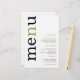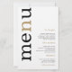 Menu de Casamento Branco da Tipografia Dourada Simples. Um preço orçamentário de 5,5" x 8,5", em uma elegante estoque LINEN de 110 lb - para uma sensação de luxo pelo valor do excelente, isso é perfeito para menus, além de convites e programas, etc. Este alternativo de tamanho de orçamento também está disponível em outras opções de papel. O estoque do cartão SEMI-GLOSS de 110 lb tem aproximadamente a mesma espessura do cartão postal, portanto também funciona bem para convites. O papel FELT de 100 lbs é colorido por buff, NÃO branco, então adiciona um toque rústico. O estoque de papel MATTE de 80 lbs é branco brilhante, para impressão nítida, excelente para seus menus e programas, enquanto o papel SATIN de 80 lbs é fino e leve Um design tipográfico moderno com Menu em grande tipografia em falta com o "n" em ouro rodado e no lado esquerdo em um fundo branco.