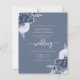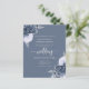 This elegant wedding invitation features dusty blue floral bouquets set off with silver faux foil greenery in two corners, on a dusty blue background. The customizable text combines silver gray serif, italic and handwriting fonts. The reverse side provides space for wedding details, along with a QR code guests can scan to visit your website and RSVP.