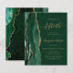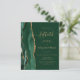The left-hand edge of this elegant modern 50th anniversary party invitation features an emerald green watercolor agate border trimmed with faux gold glitter. The customizable text combines gold-colored handwriting, copperplate and italic fonts on a green background. The reverse side features a matching green and gold agate design.