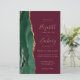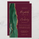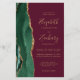 The left-hand edge of this elegant modern wedding invitation features an emerald green watercolor agate border trimmed with faux gold glitter. The customizable text combines gold-colored handwriting, copperplate and italic fonts on a burgundy red background. Add additional details on the back, along with a QR code to help your guests visit your wedding website.