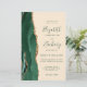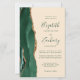 The left-hand edge of this elegant modern wedding invitation features an emerald green watercolor agate border trimmed with faux gold glitter. The customizable text combines green handwriting, copperplate and italic fonts on a champagne beige background. The reverse side features a matching emerald green and gold agate design.