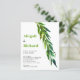 Ramo de eucalipto do BUDGET com folhas em tons verdes convite para o casamento. Um design para o seu casamento com um galho em cascata de folhas de eucalipto. O fundo é de cor verde.