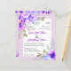 BUDGET, flores roxas de aquarela floral convite para casamento lilás floral com código QR para RSVP. Ele exibe buquês de flores em tons roxos e azuis nos cantos enquanto o texto é colocado em um quadro branco com uma borda lilás. O verso inclui as terras florais nas partes superior e inferior e o código QR para RSVP.