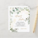 Design feature greenery eucalyptus watercolor with floral gold glitter elements. Using elegant calligraphy font in gold color for the name of the bride and groom that makes it stand-out. It also features couple photo at the back with elegant script monogram.
