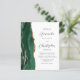 The left-hand edge of this elegant modern wedding invitation features an emerald green watercolor agate border trimmed with faux gold glitter. The customizable text combines charcoal gray script and sans serif fonts on a white background. The reverse side provides space for wedding details on a solid white background, along with a QR code guests can scan to visit your website and RSVP, which saves the cost of printing and mailing separate RSVP cards.