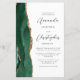 The left-hand edge of this elegant modern wedding invitation features an emerald green watercolor agate border trimmed with faux gold glitter. The customizable text combines charcoal gray script and sans serif fonts on a white background. The reverse side provides space for wedding details on a solid slate white background, along with a QR code guests can scan to visit your website and RSVP, which saves the cost of printing and mailing separate RSVP cards.
