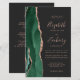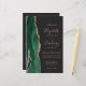 The left-hand edge of this elegant modern wedding invitation features an emerald green watercolor agate border trimmed with faux rose gold glitter. The customizable text combines rose pink handwriting, copperplate and italic fonts on an off-black background. Add additional details on the back, along with a QR code to help your guests visit your wedding website.