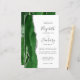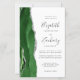 The left-hand edge of this elegant modern wedding invitation features a hunter green watercolor agate border trimmed with faux silver glitter. The customizable text combines charcoal gray handwriting, copperplate and italic fonts on a white background. The reverse side features a matching hunter green and silver agate design.