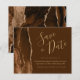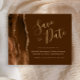 This elegant budget save the date card features a mocha brown watercolor agate border trimmed with faux gold glitter. The customizable text combines gold-colored handwriting script, copperplate and italic fonts on a brown background. The reverse side features a matching brown and gold agate design.