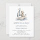This cute baby shower invitation features a dusty blue and beige watercolor illustration of a teddy bear riding in a sailboat. The words "AHOY! It's a Boy!" and the name of the mom-to-be appear in dusty blue decorative font. The reverse side provides space for diaper raffle, books for baby, and registry details, along with a convenient QR code guests can scan to visit the registry. Ideal for a nautical-themed boy's baby shower.