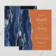 The left-hand edge of this elegant modern wedding invitation features a navy blue watercolor agate border trimmed with faux silver glitter. The customizable text combines handwriting, copperplate and italic fonts in light silver gray on a burnt orange background. The reverse side features a matching navy blue and silver agate design.