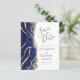 The left-hand edge of this elegant modern wedding save the date card features a navy blue alcohol ink border trimmed with faux gold foil and faux glitter. The customizable text combines charcoal gray handwriting, copperplate and italic fonts on a white background. The reverse side features a matching navy blue and gold design.