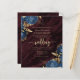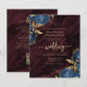 This elegant wedding invitation features navy blue floral bouquets set off with gold faux foil foliage in two corners, on a background image of burgundy watercolor agate. The customizable text combines gold-colored serif, italic and handwriting fonts. The reverse side provides space for wedding details, along with a QR code guests can scan to visit your website and RSVP, which saves the cost of printing and mailing separate RSVP cards.