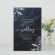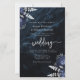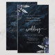 This elegant wedding invitation features navy blue floral bouquets set off with silver faux foil greenery in two corners, on a background image of navy blue watercolor agate. The customizable silver gray text combines serif, italic and handwriting fonts. The reverse side provides space for wedding details, along with a QR code guests can scan to visit your website and RSVP.