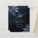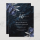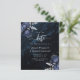 This elegant wedding save the date card features navy blue floral bouquets set off with silver faux foil greenery in two corners, on a background image of navy blue watercolor agate. The customizable text combines silver gray serif, italic and handwriting fonts. The reverse side features a matching navy blue and silver floral and agate design.