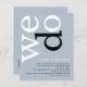Um valor para o alternativo do ORÇAMENTO em tamanho menor de 4,5 x 5,6" de semirbrilho de 110 lbs, que é de espessura semelhante a um cartão postal (no entanto, não é adequado para uso como cartão postal). POR FAVOR, OBSERVE QUE HÁ UM convite por folha. BUDGET Simples Código QR Dusty Blue Texto Convite de casamento. Adicione seu código QR ao seu site de casamento no verso para que seus convidados possam RSVP e ver todos os detalhes on-line sem a necessidade de gabinetes separados. Um design tipográfico moderno com Nós fazemos em grande tipografia em branco com o "d" em preto, rotacionado e à esquerda em um fundo de azul leve empoeirado. As cores de fundo e texto podem ser alteradas se você desejar, por meio de Personalizar mais.