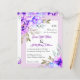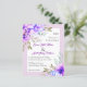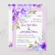 BUDGET, flores roxas de aquarela floral convite para casamento lilás floral com código QR para RSVP. Ele exibe buquês de flores em tons roxos e azuis nos cantos enquanto o texto é colocado em um quadro branco com uma borda lilás. O verso inclui as terras florais nas partes superior e inferior e o código QR RSVP.
