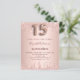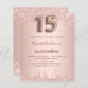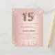 Um convite moderno, na moda e glamouroso para a Quinceañera, festa de aniversário 15. Um fundo metálico rosa dourado falso com um brilho elegante rosa dourado, pintura gota-a-gota. O nome é escrito com um moderno e escuro, rosa dourado, escrito com letra de estilo manuscrito. Personalize e adicione os detalhes da sua festa. O número 15 é escrito com uma fonte de estilo balão, script.