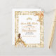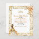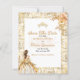 Esta placa Save the Date Quinceañera apresenta um design elegante e romântico com uma borda de filigrana de ouro, sotaques florais de pêssego mole e creme, e um delicado detalhe de borboleta. A paleta colorida de branco, ouro e pincel cria uma sensação de sonho e feminino. Uma ilustração graciosa de uma jovem em um vestido de bola floral aparece no fundo, melhorando o tema do conto de fadas. A tipografia elegante numa mistura de fontes cursivas e serif adiciona sofisticação, enquanto um gráfico de ouro tiara no topo reforça o tom real e celebratório do evento.