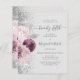 The left-hand edge of this elegant modern 50th anniversary party invitation features a mauve and dusty pink watercolor floral bouquet trimmed with silver foliage and faux silver glitter. The customizable text combines charcoal gray handwriting, copperplate and italic fonts on a pale gray background. The reverse side features a matching design.
