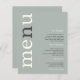 Um valor para o alternativo do ORÇAMENTO em tamanho menor de 4,5 x 5,6" de semirbrilho de 110 lbs, que é de espessura semelhante a um cartão postal (no entanto, não é adequado para uso como cartão postal). POR FAVOR, NOTE que existe UM por folha. Menu de Casamento Simples de Texto de Imersão. Um moderno design tipográfico com Menu em grande tipografia em Ivory com o "n" em cinzas, rotacionado e à esquerda sobre um fundo de sábio verde-claro. As cores de fundo e texto podem ser alteradas se você desejar, por meio de Personalizar mais.