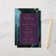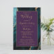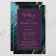 This elegant, modern wedding program features a teal agate background trimmed with gold faux glitter. The text appears in elegant gold-colored handwriting and copperplate fonts on a purple rectangle.