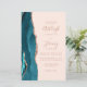 Save the cost of printing and mailing separate RSVP cards with this elegant modern all-in-one budget wedding invitation. The left-hand edge features a teal blue watercolor agate border trimmed with rose gold faux glitter. The customizable text combines dusty rose handwriting, copperplate and italic fonts on a blush pink background. The reverse side provides space for wedding details, along with a QR code guests can scan to visit your website and RSVP.