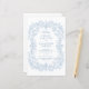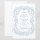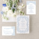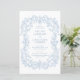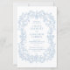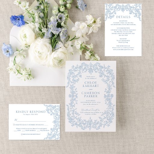 Este convite para o casamento tem um aspecto clássico e elegante com designs florais azuis à volta das bordas. O bonito escrevendo e as cores suaves dão a ela um sentimento romântico, perfeito para um casamento tradicional ou ao ar livre.