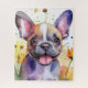 Uma imagem de arte digital de um Bulldog Francês com uma expressão lúdica, cercada por flores vibrantes e coloridas. O fundo apresenta inchaço de cores brilhantes, dando à cena uma sensação viva e enérgica.