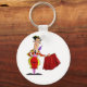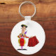 Um toureiro no anel com o touro. O matador tem uma capa vermelha. Esta design parece realmente eficaz nestes Chaveiro