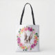 Este belo saco de tote tem um cachorrinho branco e castanho-branco e bonito, Bulldog Francês, dentro de uma coroa de bouquet de flores e folhas roxas, cor-de-rosa, pêssego, amarelas, azuis e verdes.