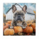 Uma pintura ao estilo aquarela de um Bulldog Francês sentado entre abóboras em frente a um celeiro branco rústico. As árvores de outono enquadram a cena com tons quentes de ouro, criando uma atmosfera sazonal aconchegante.