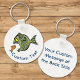 Peixe raivoso intimidando uma pequena ilustração de desenho animado. Cor de fundo personalizada. Texto personalizado de ambos os lados.