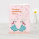Dois belos coelhos com vestidos longos e chapéus estão dançando alegremente para desejar a um grupo gêmeos um feliz aniversário. A design tem uma árvore com flores, e o fundo é uma rosa claro. Cartão perfeito para enviar a gêmeos jovens.