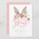 Este convite para a Páscoa divertida de Brunch apresenta orelhas de coelho de cor d'água sobre as palavras "Páscoa Brunch & Ovo Hunt." Todos os detalhes do convite estão diretamente abaixo em um fundo branco brilhante. O lado de trás é um padrão de gingham cor-de-rosa.