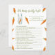 Convites para chuveiros de bebês neutros em termos de gênero. Apresentando o ditado "UM PEQUENO BUNNY ESTÁ A CAMINHO!", uma ilustração de um coelho aquoso (coelho) com cenoura em patas, e muitas cenouras cor de laranja. Itens correspondentes disponíveis.